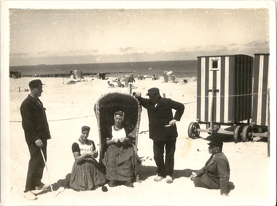 Deze foto is op dezelfde dag gemaakt, heel kort of na de foto die op het affiche staat. De badmannen dragen in die tijd meekraprode pakken op het strand.Over de kleur van de pakken van de mannen die direct naast Martina en Kee staan zijn de meningen een beetje verdeeld. De pakken lijken erg donker, terwijl de man met de pijp duidelijk een lichter pak aan heeft.